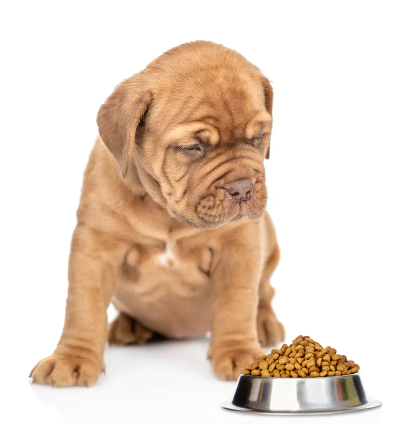 Щенок у миски с кормом. Источник фото: 123rf.com