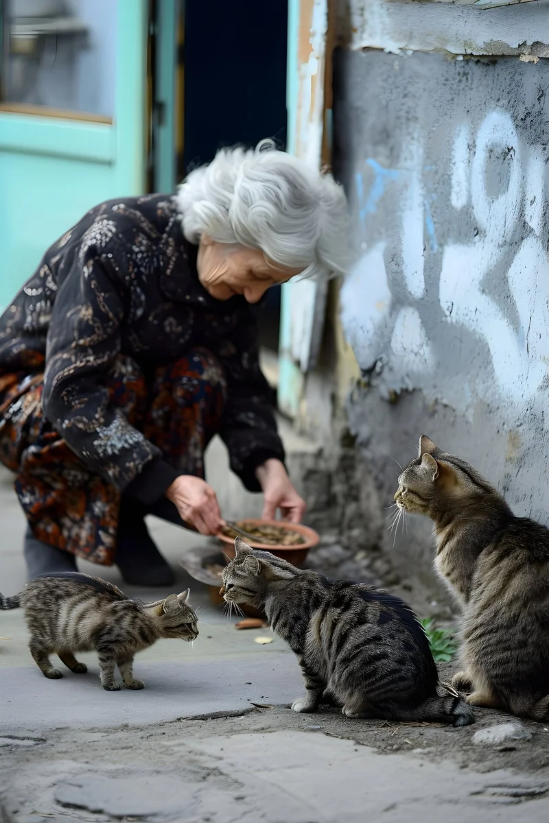 Пожилая женщина кормит бездомных кошек. Источник фото: freepik.com