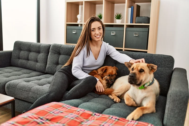 Домашние питомцы отдыхают на диване возле хозяйки.