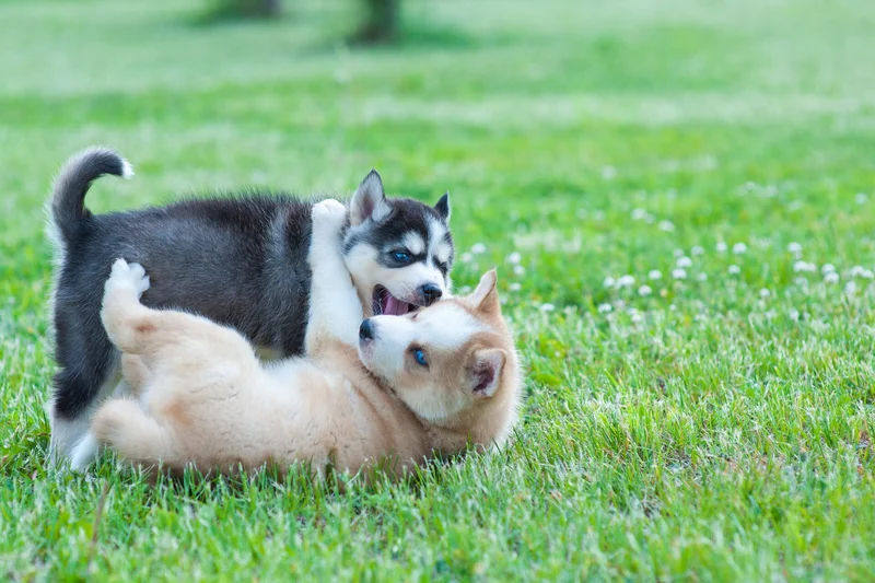 Щенки играют на улице.